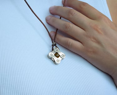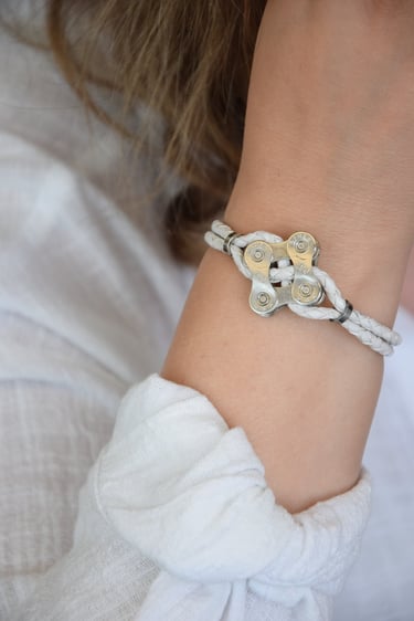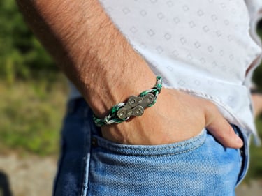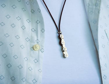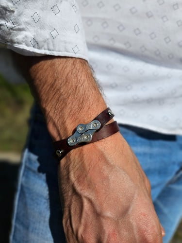 Unsere Schmuckstücke werden aus hochwertigem Leder, strapazierfähigem Paracord und verschiedenen Metallelementen gefertigt. Wir legen großen Wert auf nachhaltige Materialien und eine sorgfältige Verarbeitung. Die Metallelemente stammen aus alten Fahrradketten (legierter Stahl), die gründlich gereinigt und aufbereitet werden, bevor sie in unsere Designs integriert werden. Dieser Upcycling-Prozess reduziert Abfall und gibt den alten Fahrradketten ein neues Leben als stilvolle und einzigartige Schmuckstücke.